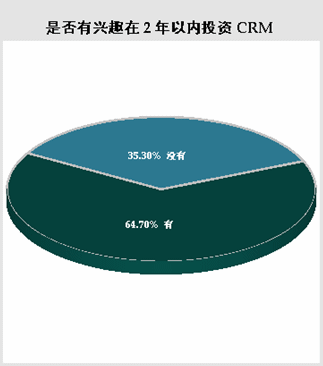 在選擇“尚未使用任一CRM軟件”的被調(diào)查者中,當(dāng)被問(wèn)及基于現(xiàn)在的狀況,“是否有興趣在兩年以?xún)?nèi)投資CRM”。有64.70%的被調(diào)查者選擇有興趣在兩年內(nèi)投資CRM軟件,而選擇沒(méi)有興趣在兩年內(nèi)投資CRM軟件的只占35.30%。盡管現(xiàn)在實(shí)際使用CRM軟件的用戶(hù)所占比例還不甚理想,但市場(chǎng)前景還是非?春,大部分公司具有實(shí)施CRM軟件的需求。
