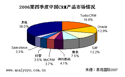 易觀國(guó)際研究表明,中國(guó)CRM產(chǎn)品市場(chǎng)2006年第4季度總體市場(chǎng)規(guī)模達(dá)到0.81億人民幣,季度增長(zhǎng)率達(dá)到4.2%,體現(xiàn)了穩(wěn)健增長(zhǎng)的趨勢(shì)。具體廠商方面,TurboCRM,Oracle(甲骨文),SAP位居領(lǐng)先地位。