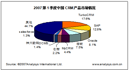 易觀國(guó)際研究表明,中國(guó)CRM產(chǎn)品市場(chǎng)2007年第1季度總體市場(chǎng)規(guī)模達(dá)到0.79億人民幣,同比季度增長(zhǎng)率達(dá)達(dá)到13%,體現(xiàn)了穩(wěn)健增長(zhǎng)的趨勢(shì)。具體廠商方面,TurboCRM,SAP,Oracle(甲骨文)位居領(lǐng)先地位。
