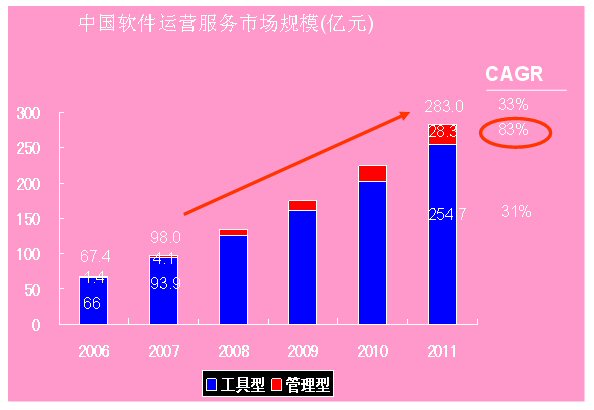 2006中國(guó)軟件運(yùn)營(yíng)服務(wù)(SaaS)產(chǎn)業(yè)的規(guī)模為68億元,2011年將突破400億,達(dá)到406億元,未來五年的復(fù)合增長(zhǎng)率達(dá)到43%。這是國(guó)內(nèi)ICT領(lǐng)域權(quán)威研究機(jī)構(gòu)計(jì)世資訊(CCW Research)在其最新發(fā)布的《軟件業(yè)的下一個(gè)十年——中國(guó)軟件運(yùn)營(yíng)服務(wù)(SaaS)市場(chǎng)發(fā)展趨勢(shì)研究報(bào)告》中指出的。