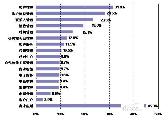 。。調(diào)查顯示,2007年有45.3%的企業(yè)還未應(yīng)用CRM信息化系統(tǒng)。在已經(jīng)應(yīng)用該系統(tǒng)的企業(yè)中,CRM系統(tǒng)應(yīng)用主要就是客戶管理,占到31.9%;其次是客戶信息管理和聯(lián)系人管理,這些應(yīng)用比例集中在23~31%之間;其他應(yīng)用還有銷售管理(19.5%)、時(shí)間管理(15.1%)、供應(yīng)商關(guān)系管理(12.8%)、客戶服務(wù)(11.5%)和營(yíng)銷管理(10.5%)等,呼叫中心、合作伙伴關(guān)系管理、商業(yè)智能、電子商務(wù)、電話銷售、知識(shí)管理、電話營(yíng)銷等比例均在10%以下。