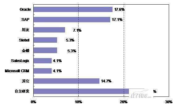 。。 在開展了CRM系統(tǒng)應(yīng)用的企業(yè)中,CRM系統(tǒng)品牌認(rèn)知率最高的是ORACLE和SAP,分別占17.6%和17.1%;其他品牌還有用友(7.1%)、Siebel(5.3%)、金碟(5.3%)、Sales Logix(4.1%)和Microsoft CRM(4.1%)等;另有24.7%的企業(yè)是自主開發(fā)的CRM系統(tǒng)。