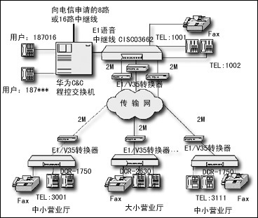 市聯(lián)通通過在Cisco 3662路由器上配置一個NM-HDV-1E1-30E語音中繼模塊,通過75歐姆同軸電纜與華為程控交換機的E1接口板相連,提供30路話音,該路由器用作語音網(wǎng)關(guān)。各網(wǎng)點配置神州數(shù)碼路由器,配置MR-VIC-2FXS或MR-NM-4FXS語音模塊,提供多路語音。