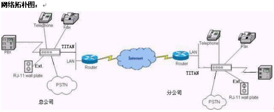 在公司長途話務量最集中(當然也是話費最高)的兩端(或數(shù)端),分別安裝一臺我公司研制生產(chǎn)的TITAN VOIP語音設備,并通過ADSL、Cable Modem或者數(shù)據(jù)專線將它們互聯(lián)起來,將可以使您現(xiàn)有大范圍分散于各處的PBX,以最低的運作成本(長途話費為零),連接到一起,猶如整個公司在使用一個巨大的PBX系統(tǒng)。你可以只拔打一個號碼就進入另一個遠端PBX系統(tǒng),將現(xiàn)有的資源運用至極限。