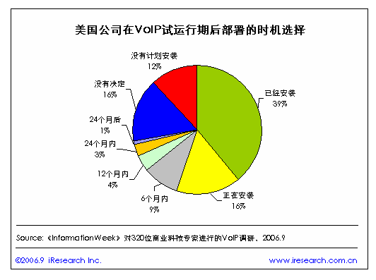 iResearch艾瑞市場咨詢整理《InformationWeek》對320位商業(yè)科技專家進(jìn)行的VoIP調(diào)研數(shù)據(jù)顯示,美國有近四成的公司在VoIP試運(yùn)行期后安裝了VoIP,正在安裝的也達(dá)到了一成以上,打算在6個(gè)月以內(nèi)安裝的有近一成。