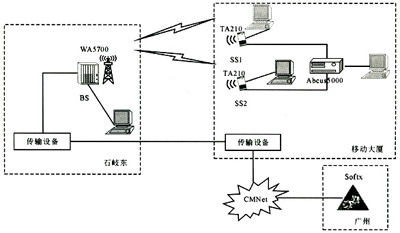 組網(wǎng)時,由于BS(石岐東)需要與廣州的SoftX連接,因此,實際組網(wǎng)方案通過傳輸設備連接公安局與移動大廈;然后通過移動大廈的CMNet網(wǎng)絡連接廣州的SoftX。在該個組網(wǎng)中,視距傳播環(huán)境通過固定在移動大樓支架上的遠端站實現(xiàn),非視距傳播環(huán)境通過移動的遠端站實現(xiàn)。