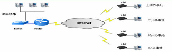 數(shù)據(jù)網(wǎng)絡(luò):各地辦事處通過ADSL接入Internet,構(gòu)建在Internet上與總部互通的寬帶網(wǎng)絡(luò)。