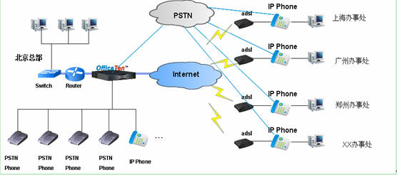 在企業(yè)總部部署一臺OfficeTen,利用OfficeTen的軟交換功能實現(xiàn)企業(yè)內(nèi)部IP網(wǎng)絡(luò)放號、IP Phone的注冊管理和寬帶網(wǎng)絡(luò)的接入,并可實現(xiàn)總部分機同時具有外線號碼功能。OfficeTen通過多路FXO口接入PSTN網(wǎng)絡(luò),通過Ethernet口接入Internet,實現(xiàn)語音和數(shù)據(jù)的綜合接入;對內(nèi)通過Ethernet口連接內(nèi)部Router和Switch,通過FXS口接入模擬PSTN