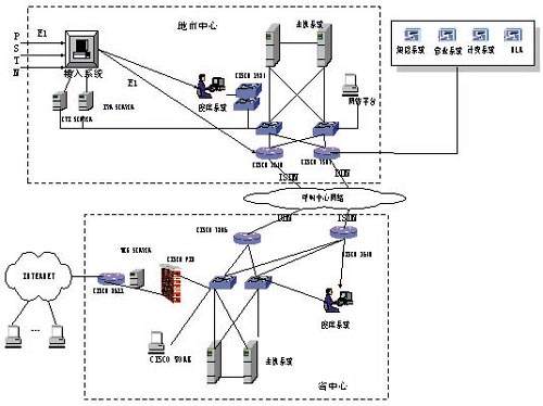 1924和中心交換機(jī)互聯(lián);在廣域網(wǎng)上,各地市和省中心通過(guò)2M DDN線路實(shí)現(xiàn)互聯(lián),通過(guò)ISDN線路實(shí)現(xiàn)線路備份,考慮到WEB受理的需要,全省呼叫中心系統(tǒng)設(shè)置統(tǒng)一的WEB服務(wù)器,設(shè)在省中心,通過(guò)CISCO