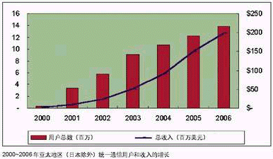 據(jù)IDC預(yù)測(cè),亞太地區(qū)(不包括日本)統(tǒng)一通信用戶數(shù)量將從2000年的32萬(wàn)增長(zhǎng)到2006年的1385萬(wàn)。盡管起點(diǎn)較低,收入將從2000年的119萬(wàn)美元增長(zhǎng)到2006年的1.987億美元。這個(gè)增長(zhǎng)大部分受中國(guó)和澳大利亞推動(dòng),在這兩個(gè)國(guó)家,價(jià)格和市場(chǎng)由上層大電信公司決定。