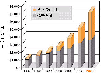 為了獲得競爭優(yōu)勢,業(yè)務(wù)提供商──傳統(tǒng)長途運(yùn)營和本地交換運(yùn)營商,因特網(wǎng)業(yè)務(wù)提供商(ISP),應(yīng)用業(yè)務(wù)提供商,以及無線運(yùn)營商──都在想方設(shè)法發(fā)布基于IP的業(yè)務(wù),這些業(yè)務(wù)應(yīng)該:對用戶有較高的價值,能縮短面市所需時間,部署是低成本高效益的。向用戶提供高價值的增值業(yè)務(wù)能為業(yè)務(wù)提供商帶來重要的收入源泉,并使他們更有特色,增加市場分額,特別是如果這些業(yè)務(wù)以快速、易于支持的方式部署,以上這些優(yōu)勢就會更加突出。據(jù)估計(jì),到2003年增值業(yè)務(wù)設(shè)備僅在美國就能達(dá)到73億美元的市場,正如圖1所示。