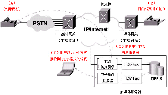 T.38規(guī)定了實(shí)時IP傳真的標(biāo)準(zhǔn)。因此,源于PSTN的一個傳真會話能夠以T.38的格式進(jìn)入IP網(wǎng)絡(luò)。在IP媒體服務(wù)器中通過使用T.30,T.38和T.37,實(shí)時傳真會話可以把IP媒體服務(wù)器作為終端,并把實(shí)時傳真轉(zhuǎn)換成T.37兼容的傳真消息。然后,這個傳真消息會被用來產(chǎn)生一個就象一個電子郵件會話的T.37傳真。這使得IP媒體服務(wù)器可以提供"永不示忙"的IP傳真功能。這個功能也將為統(tǒng)一消息應(yīng)用提供基于IP的傳真郵箱能力。