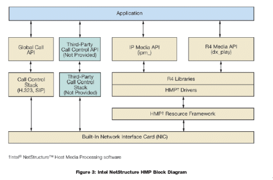 HMP軟件結構與Dialogic Dialogic 板卡DM3結構同樣的方式, 但不需要專門的硬件。