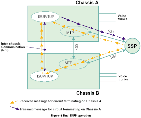 一個雙ISUP/TUP系統(tǒng)通過激活每個機箱中的一半電路協(xié)議狀態(tài)機進行工作。每個ISUP/TUP層通過本地MTP3發(fā)送所有的傳送業(yè)務。本地MTP3采用與相鄰SS7節(jié)點之間的本地鏈路進行傳輸,如果該鏈路發(fā)生故障,采用機箱之間的SS7連接。