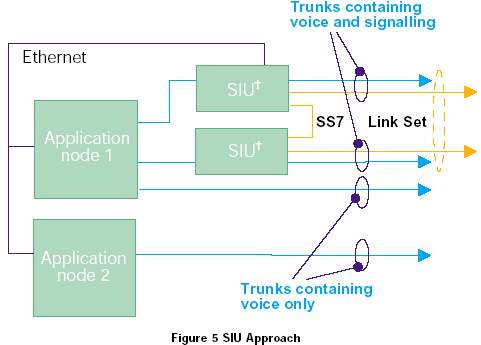 SIU通過從媒介處理中使用以太網(wǎng)分離SS7接口來處理容錯的問題,兩個SIU作為一個節(jié)點編碼進行容錯,如圖5所示,通過分離SS7接口,SIU也允許系統(tǒng)最多可以由32個處理語音電路(媒介)的應用節(jié)點組成。