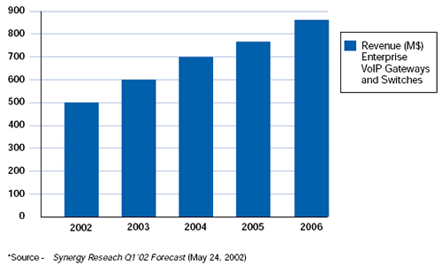 然后, Synergy也預(yù)測VoIP網(wǎng)關(guān)和交換應(yīng)用從2002年到2006年每年會有34.6%的增長. 需要產(chǎn)品來把傳統(tǒng)電話交換網(wǎng)絡(luò)和IP網(wǎng)絡(luò)橋接起來.
