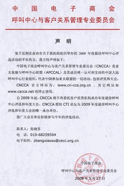 鄭重聲明: CNCCA授權(quán)CTI論壇為2009年度中國(guó)(亞太)最佳呼叫中心評(píng)選和年度大會(huì)的唯一承辦單位。