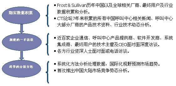 Frost & Sullivan 和 CTI論壇(www.99cup.com)共同組成的調(diào)研小組,在查閱了大量資料的基礎(chǔ)之上,以企業(yè)通信及呼叫中心的設(shè)備應(yīng)用、投資計劃以及相關(guān)廠商的市場表現(xiàn)為出發(fā)點,通過對企業(yè)通信及呼叫中心重要應(yīng)用企業(yè)、在市場占主導(dǎo)地位的二十多家設(shè)備廠商、二十多家軟件開發(fā)商、十幾家系統(tǒng)集成商、數(shù)家外包運營商的深度訪談,參閱內(nèi)部相關(guān)報告及數(shù)據(jù)庫,對數(shù)據(jù)的來源和數(shù)據(jù)的準確性進行了詳細核對與論證;憑借參與調(diào)研人員的多年從業(yè)經(jīng)
